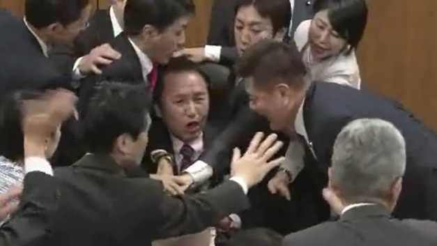 委員長の口をふさぐ、マイクを奪おうとする野党。